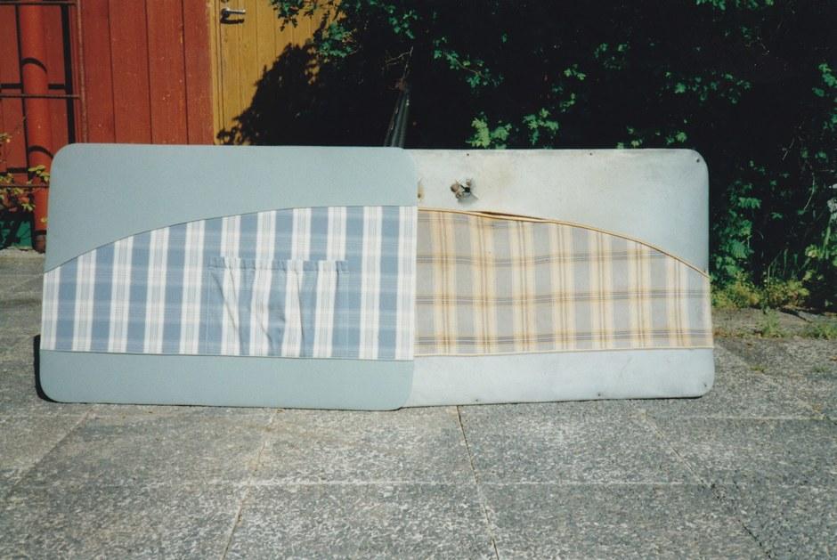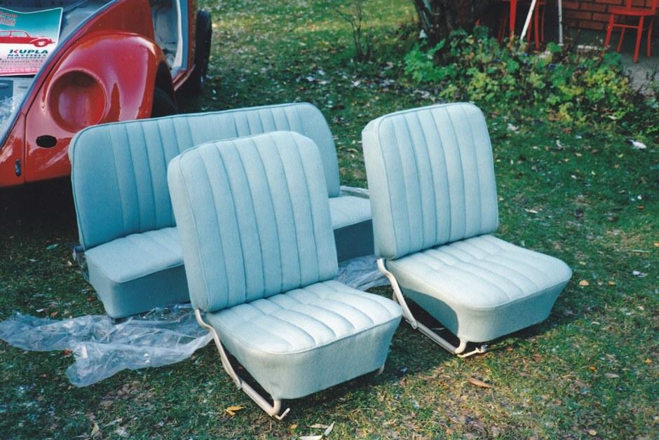 Penkkien ja ovipielien verhoilun päätimme luovuttaa osaavampien käsiin ja niinpä penkit lähtivät Teuvan ammatilliseen aikuiskoulutuskeskukseen. Siellä ne purettiin ja otettiin verhoiluista tarvittavat mitat. Sen jälkeen penkkien rungot ja jouset tulivat takaisin Vaasaan korjattaviksi ja maalattaviksi. Maalatut rungot ja jouset toimitettiin takaisin Teuvalle samoin kuin vanhat paneelit. Välillä käytiin taas tapaamassa maalaria. Verhoilut valmistuivat aikanaan ja sovimme, että viemme Wäinön Teuvalle sisäkaton verhoilua varten kunhan saisimme sen maalaamosta. Kesä 1993 kului itselläni muissa merkeissä, enkä ehtinyt juuri Wäinöä rakentaa. Koska auto oli ollut maalaamossa jo yli vuoden, oli meidän pakko ilmoittaa hakevamme sen ehdottomasti pois määrättynä päivänä. Maalarin kanssa oli todella ongelmia. Onneksi saimme Wäinön takaisin! Siispä auto kiireesti Teuvalle, kattoverhoilu paikoilleen ja takaisin Vaasaan.